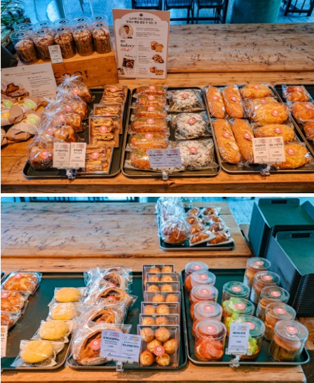 전형적인 베이커리 카페의 분위기이며 단체테이블부터 원형테이블까지 다양하게 마련되어 있습니다.