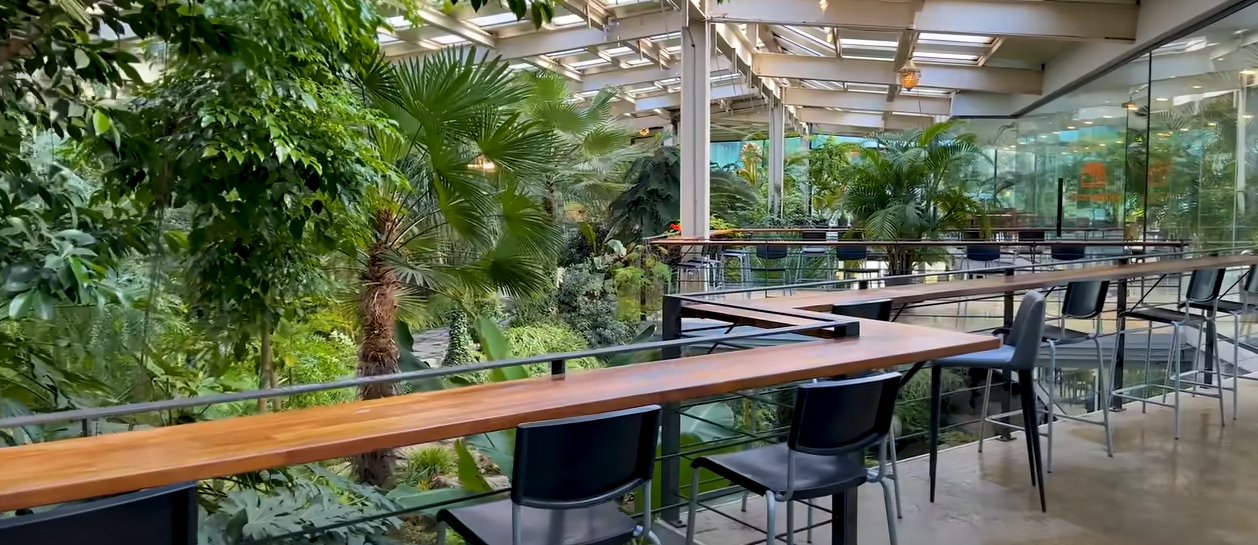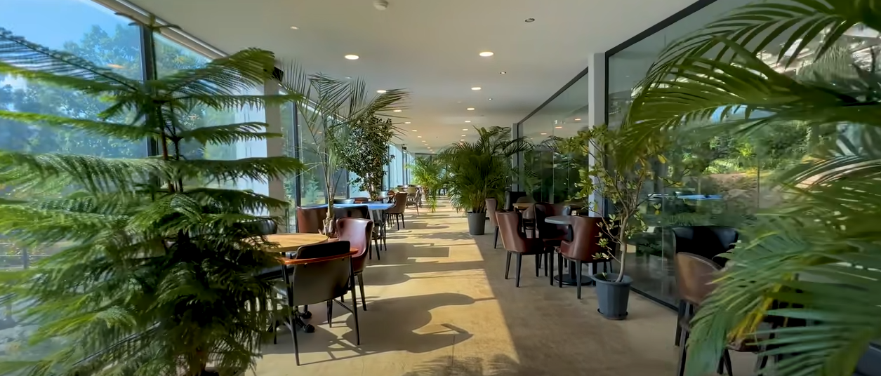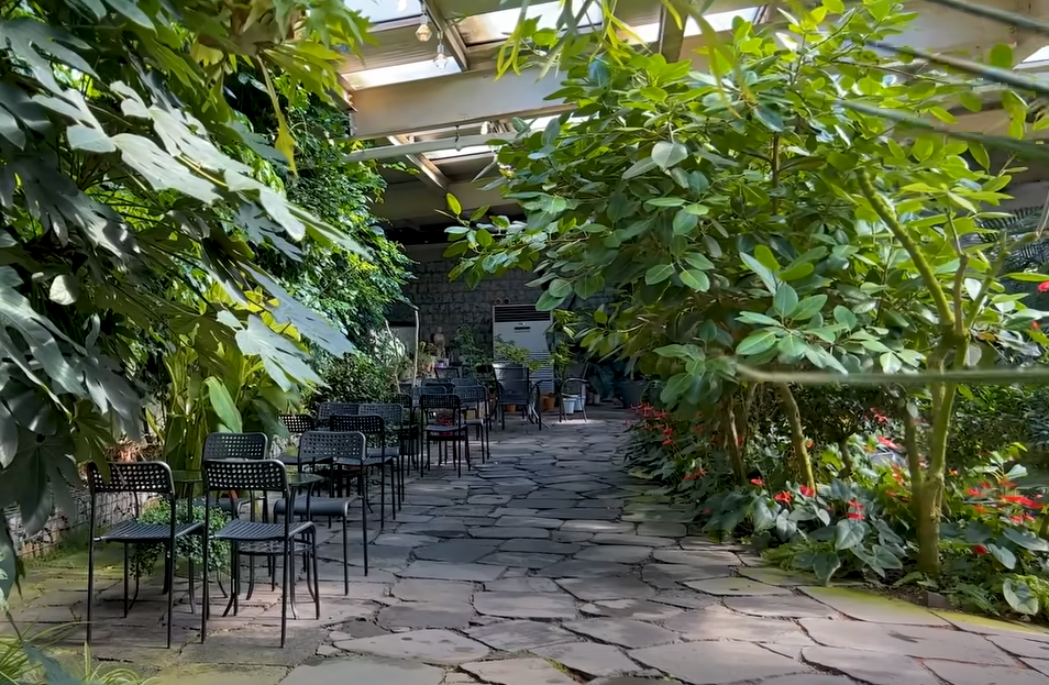 정원 곳곳에 테이블을 배치하여 자연 속에서 여가를 즐기는 느낌입니다.