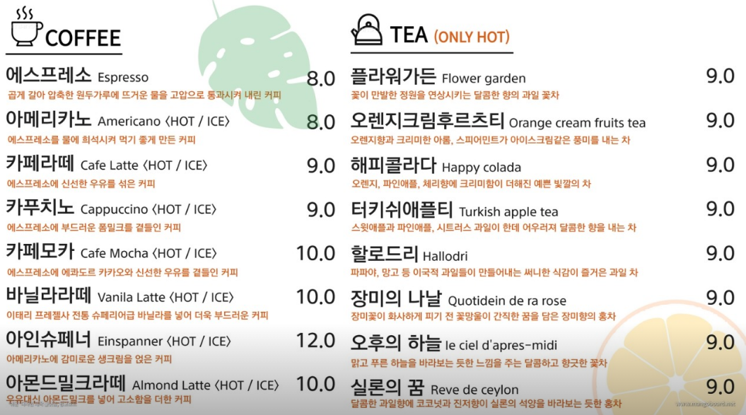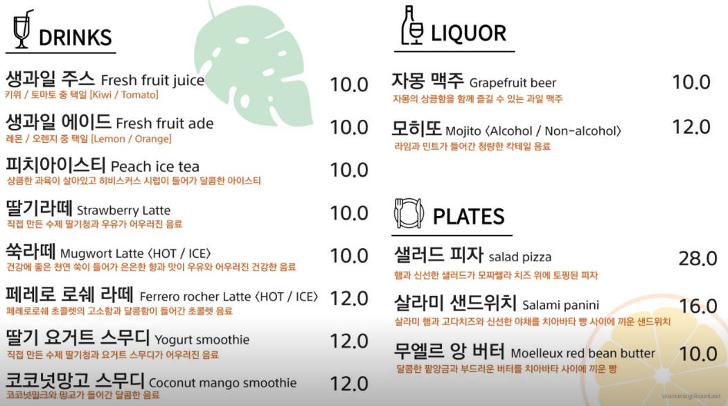 양주 오랑주리 메뉴