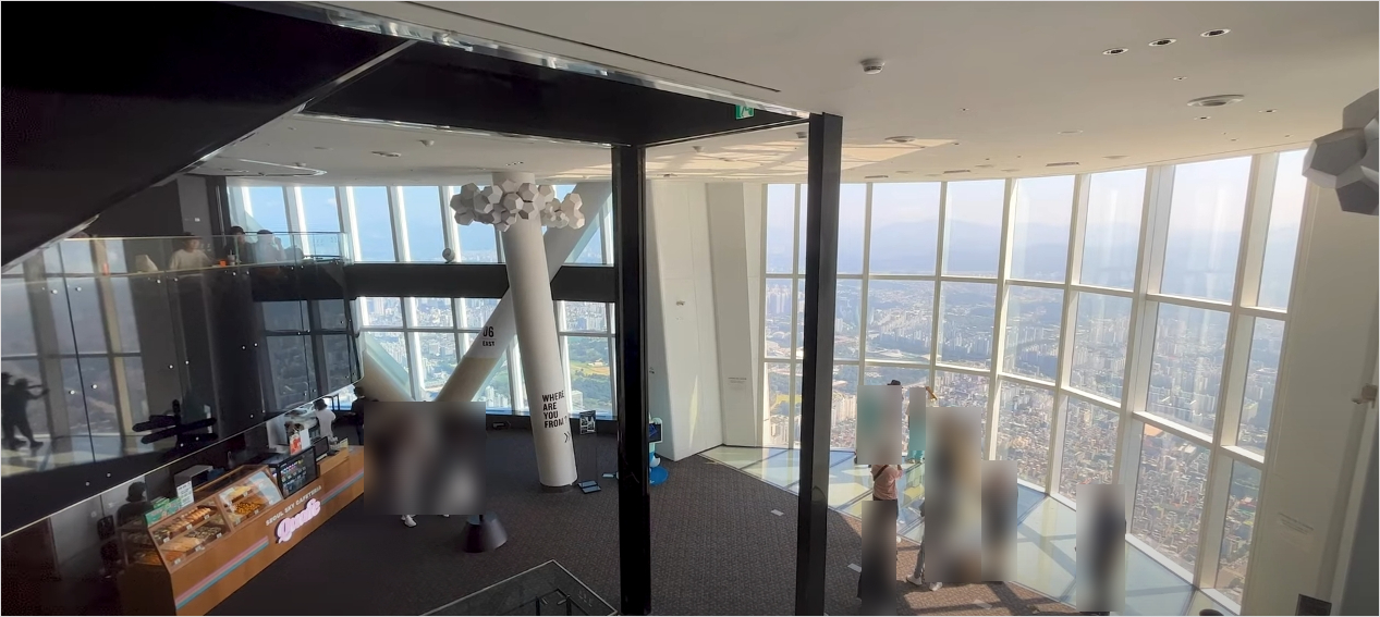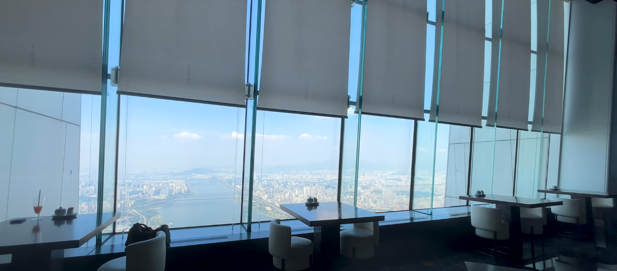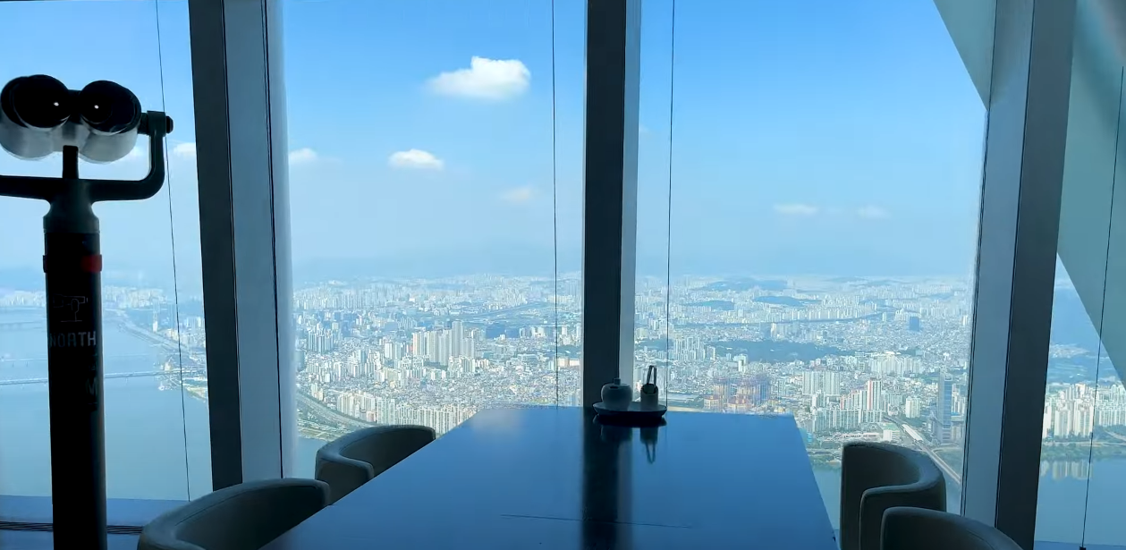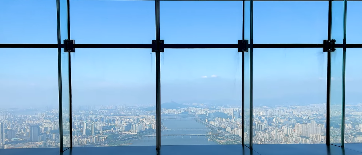 117층에 도착하면 바로 스카이쇼를 관람할 수 있게 됩니다. 하늘 위에서 펼쳐지는 영상쇼로 격변의 시간 동안 놀라운 성장을 보여준 서울의 역사를 담아내는 미디어 아트가 상영됩니다. 멋진 영상에 푹 빠져 감상하다 보면 놀라운 광경이 펼쳐집니다. 스크린이 갈라지면서 영상의 마지막 장면인 한강이 실물로 보이게 되며 모든 관광객이 일제히 감탄을 연발합니다.