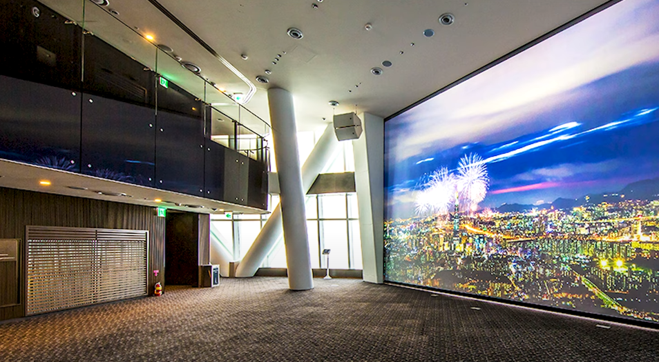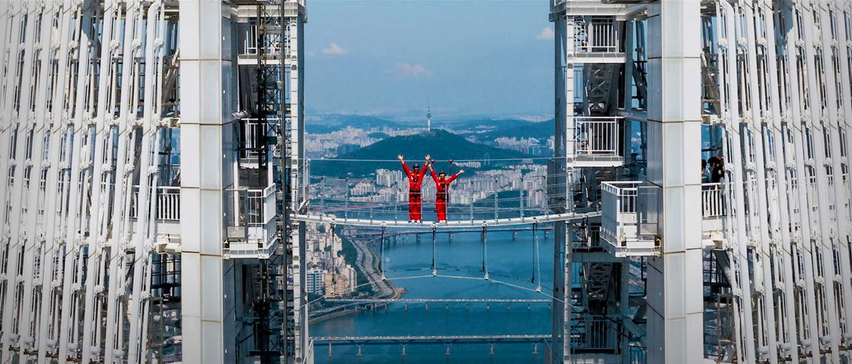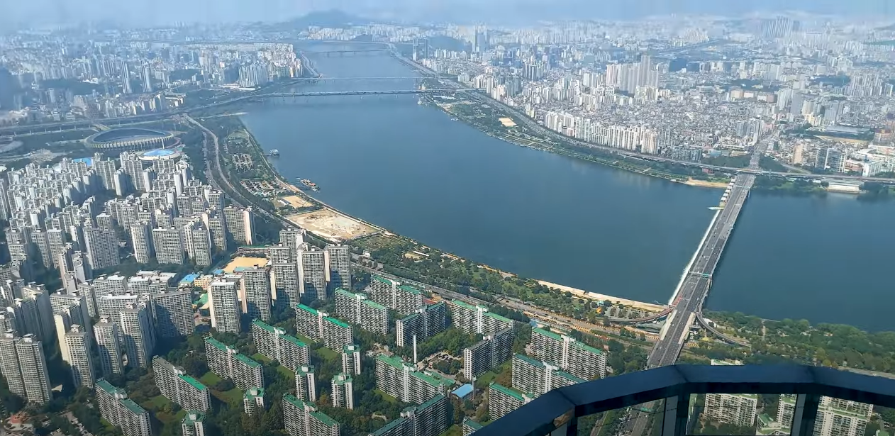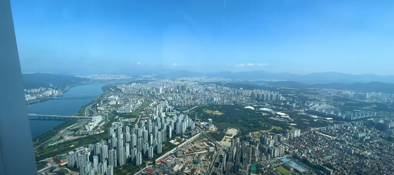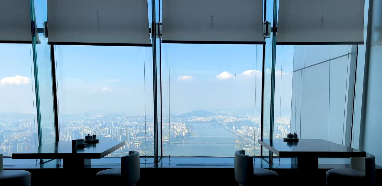 117층에 도착하면 바로 스카이쇼를 관람할 수 있게 됩니다. 하늘 위에서 펼쳐지는 영상쇼로 격변의 시간 동안 놀라운 성장을 보여준 서울의 역사를 담아내는 미디어 아트가 상영됩니다. 멋진 영상에 푹 빠져 감상하다 보면 놀라운 광경이 펼쳐집니다. 스크린이 갈라지면서 영상의 마지막 장면인 한강이 실물로 보이게 되며 모든 관광객이 일제히 감탄을 연발합니다.