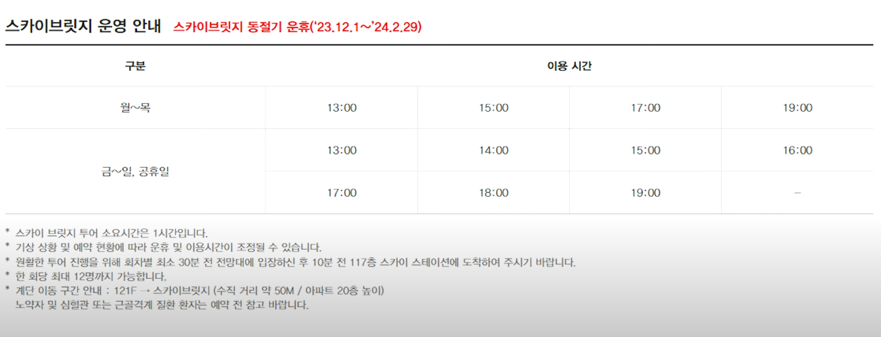 스카이 브릿지는 동절기 동안 운영하지 않으며 3월부터 재개장됩니다. 스카이브릿지 소요시간은 1시간이며 기상 상황에 따라 운영이 중지될 수 있습니다. 121층부터 스카이브릿지까지 아파트 20층높이의 계단을 이용해야하기 때문에 예약 전 건강상태를 확인하시길 바랍니다.