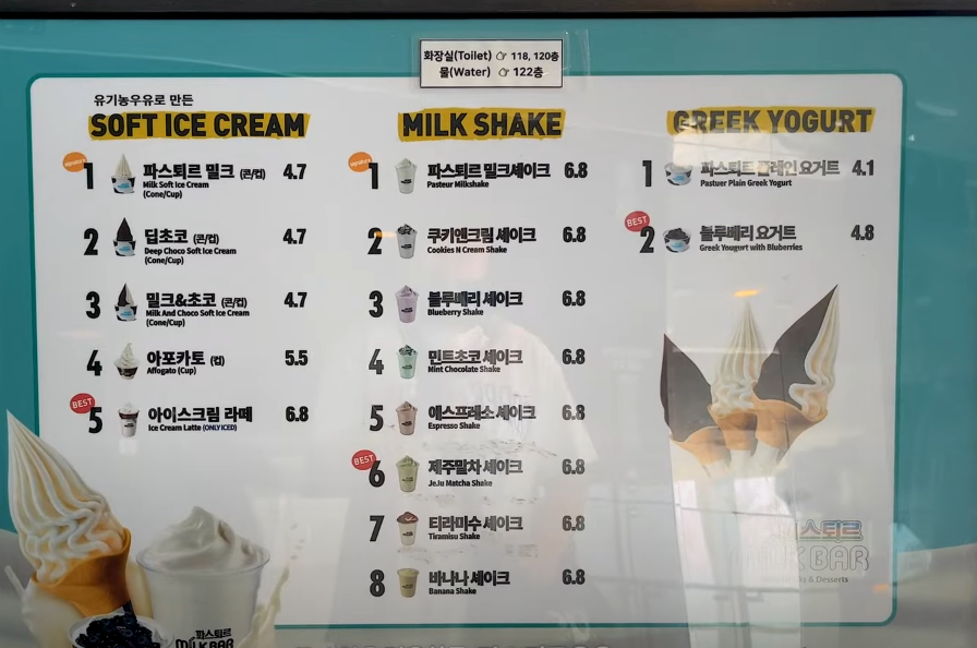 119층에는 우유디저트 전문점인 파스퇴르 밀크바(스카이 프렌즈카페)가 있습니다. 발코니 형태의 공간으로 취식할 수 있는 공간이 넓지는 않지만 서울 스카이의 풍광을 즐길 수 있습니다. 아이스크림과 셰이크를 판매합니다.