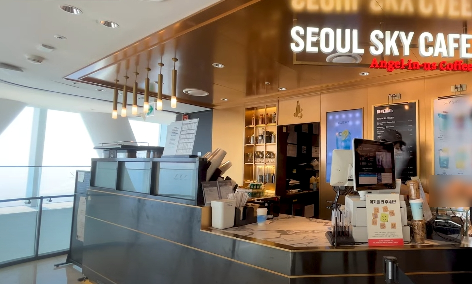 계단을 통해 하늘 아래 가장 높은 카페라는 타이틀을 가진 엔제리너스 커피가 있습니다. 122층에 위치하고 있으며 2인석과 벤치형 테이블이 준비되어 있습니다. 창가에 앉으면 환상적인 풍경을 마주할 수 있습니다. 음료가격은 5,200원 ~ 7,800원 사이이며 서울스카이에서만 판매하는 시그니처메뉴가 있습니다.
