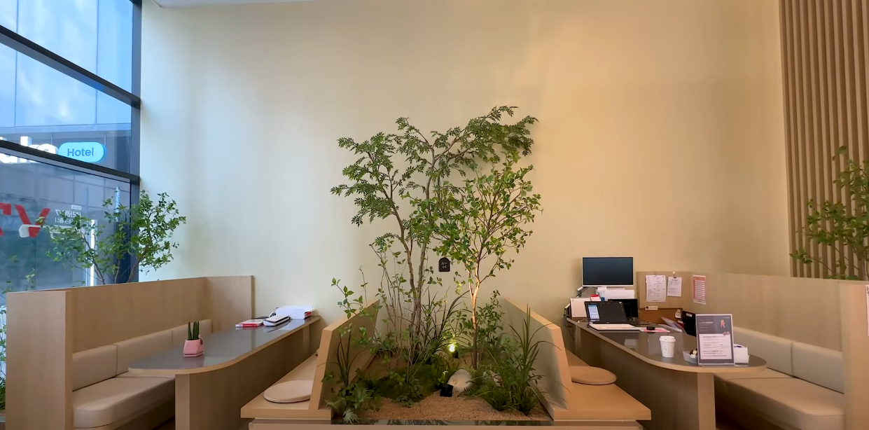카페에 들어서면 플랜테리어와 높은 층고로 공간과 카운터가 나옵니다. 카운터에 쿠폰을 보여드리면 음료를 선택할 수 있도록 준비해주십니다. 메뉴판에 있는 모든 음료 주문이 가능합니다. 음료 외의 메뉴로는 간단한 주전부리도 판매 중이었습니다. 전체적으로 베이지톤의 인테리어와 바닥의 콩자갈 시공으로 자연에 가까운 이미지며 벤치형 의자와 식물들로 공간을 나누어 편안하고 여유롭게 공간을 즐길 수 있습니다.